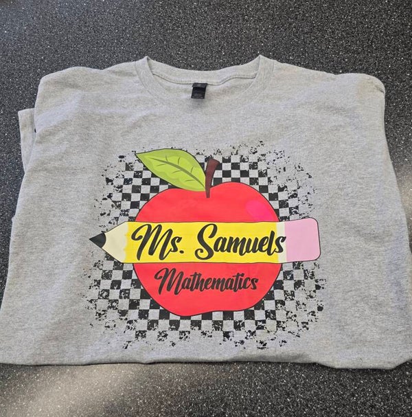 An apple -personalized the way you like- pressed onto a soft style Gildan tee of your choice. The design also includes your school's logo on one sleeve and the name of the mascot on the other sleeve.