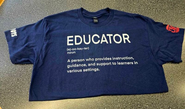 DEFINITION OF AN EDUCATOR template pressed onto a soft style Gildan tee of your color choice. The personalization includes your school logo on one sleeve and your school mascot on the other.