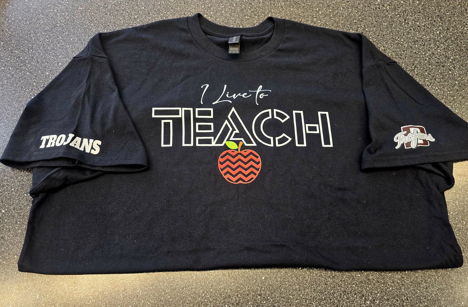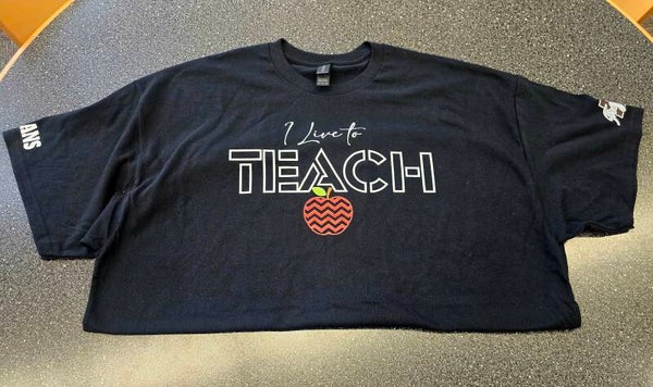 I LIVE TO TEACH template pressed onto a soft style Gildan tee in the color of your choice. The personalization includes your school mascot on one sleeve and the name of the mascot on the other sleeve.